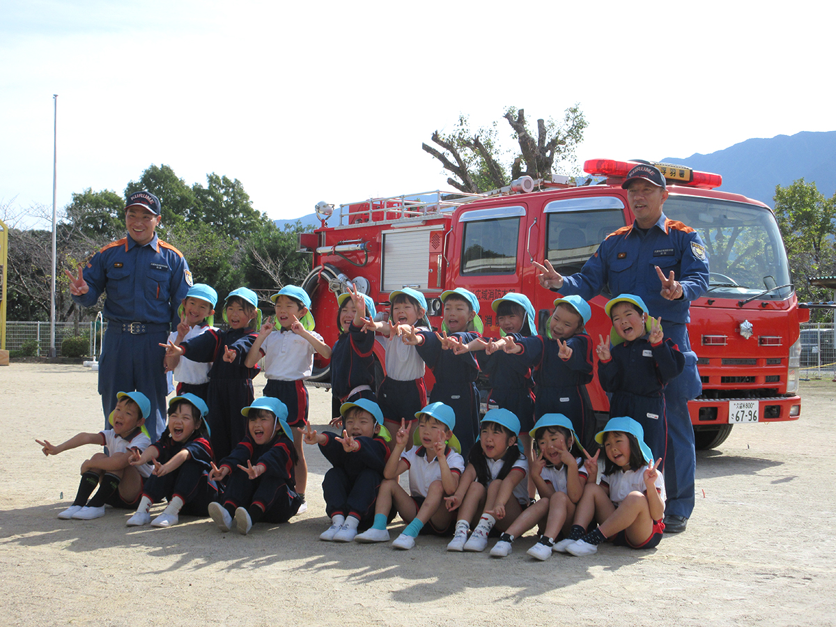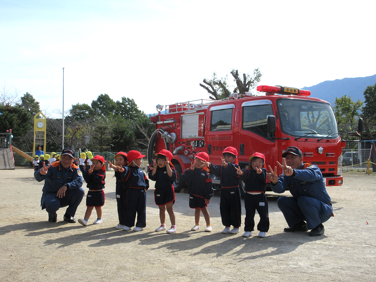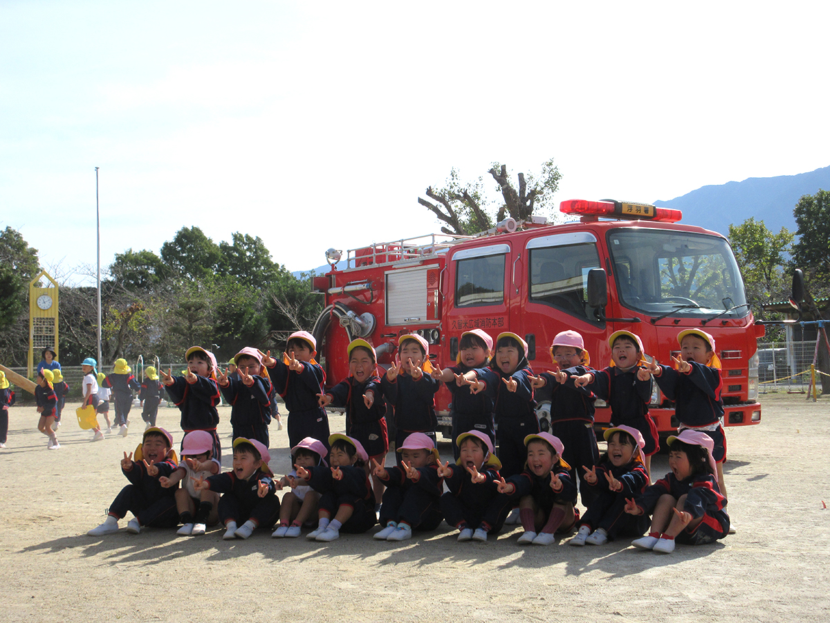 10月29日に防火訓練を行い、その後防火図画を描きました。かっこいい消防車にワクワクでしたね。訓練も先生のお話をよく聞いて、とても上手にできて消防署の方 に褒められていました。