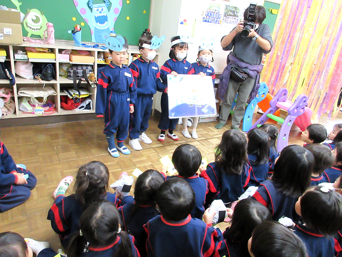 3月4日に共同制作を行いました。 うめ組さんが「おむすびころりん」のお話で各クラスのお友だちを招待して食に関するお話とリンクさせてとても楽しくためになる発